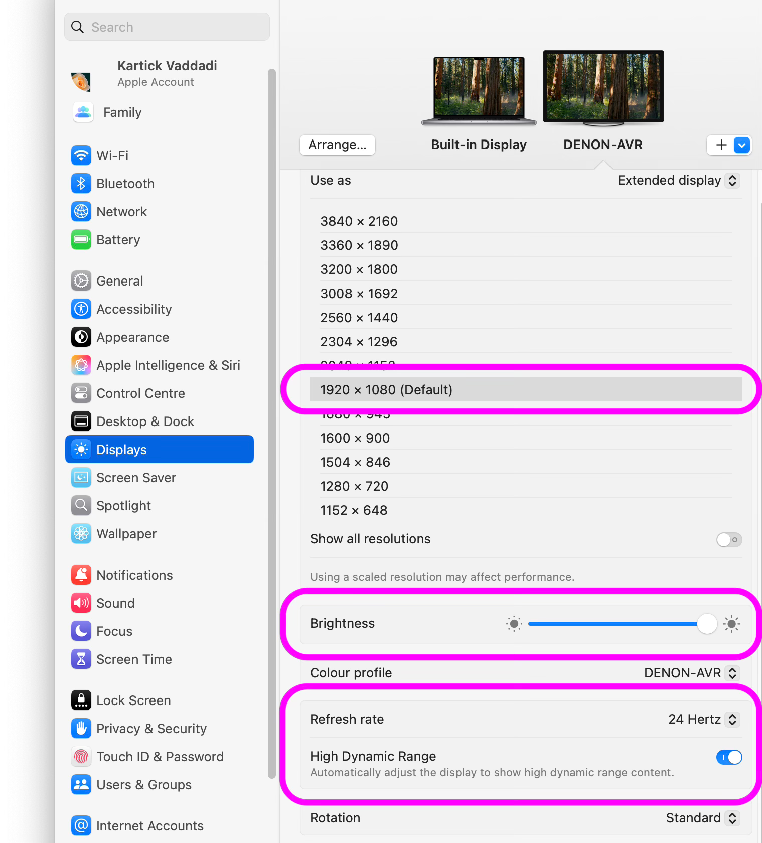 If you’re routing through a receiver, then the receiver (and the second HDMI cable in the chain) can also become bottlenecks. Mine was misconfigured — it was set to standard rather than enhanced mode. So I fixed it. But some limitations can’t be fixed. For example, mine doesn’t support VRR, which both my TV and my laptop do. Luckily, I don’t play games. If this was important to me, I’d have to bypass the receiver and connect the gaming device directly to the TV.