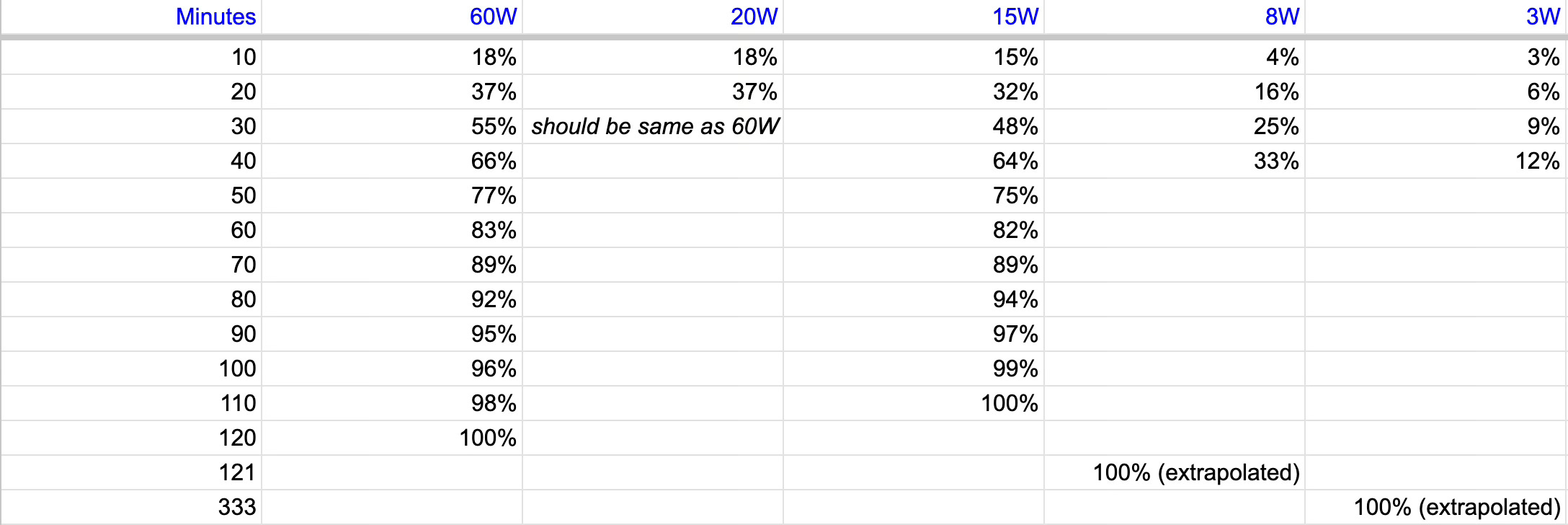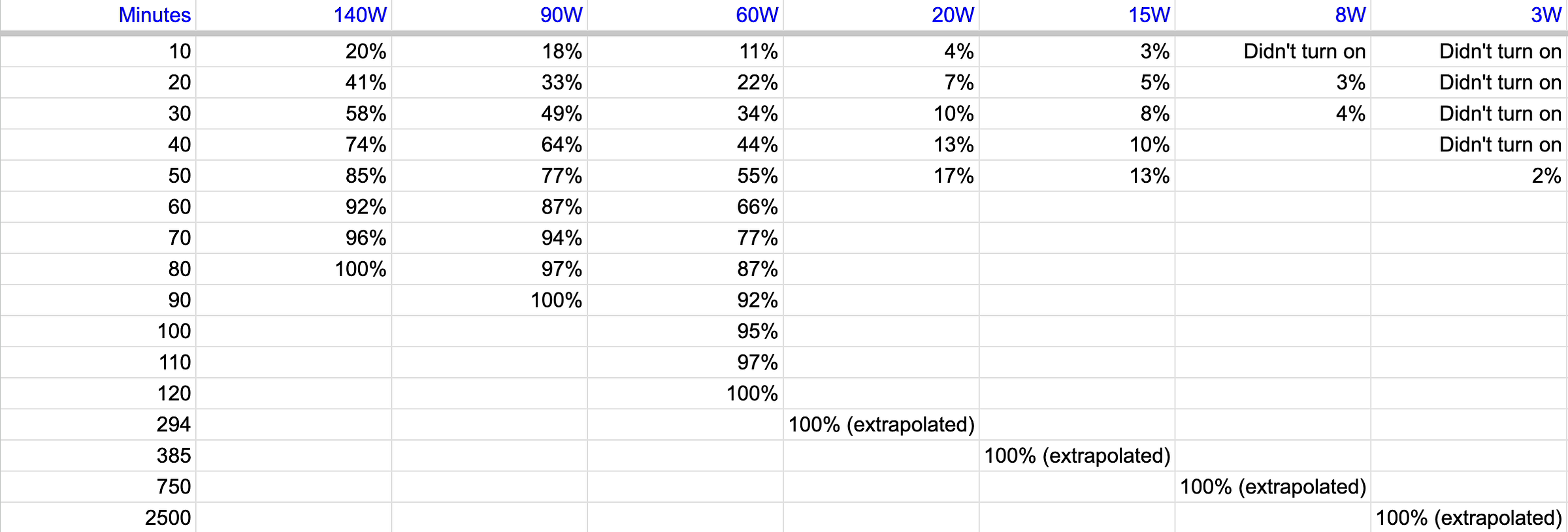 With the slow chargers, I didn’t have the patience to wait for 100%, so I extrapolated.
